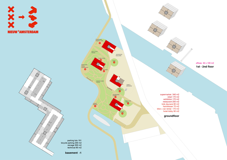 Specific NYC landmarks and programs serve as inspiration for the programmatic composition of the 24.000 m2 GFA. A compilation of metropolitan functions is transferred to ‘Nieuw Amsterdam’.
