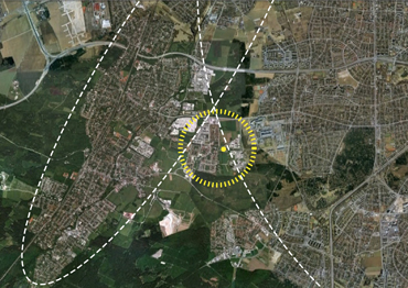 Unser Ansatz für die Neuordnung der Ortsmitte Martinsried bezieht sich zum einen auf den städtischen Impuls für die Ortsentwicklung, der von dem Campusausbau und von der U-Bahn ausgeht, zum anderen auf die in der Ortsstruktur bereits angelegten Potentiale, die es zu ordnen und räumlich und programmatisch zu stärken gilt.