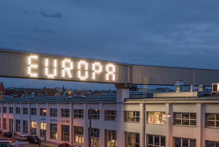 On the occasion of the cultural weekend 'Offen auf AEG', EUROPA is glowing in Nürnberg at the so-called 'Dallmann' - the former conveyor belt of the converted 'auf AEG' area.