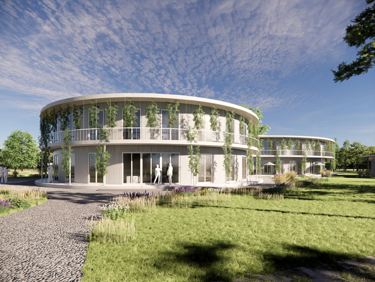 The large oak tree roughly in the middle of the property provides us with this anchorage and the center around which we are developing the academy. It is a flat, two-storey ensemble of circular wooden buildings. The green surrounding balconies and terraces create a transition from the house to garden and landscape.