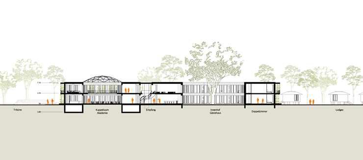 The smaller building houses the Academy rooms, which are arranged around the central double-height room. The dome room itself can be used in many ways, e.g. as a sports and exercise room, for readings or concerts or for academy festivals.