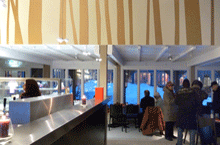 The new kiosk building for the bath 'Mythenquai' preserves the spacious lawn with solitary trees along the shore. The impressive landscape of the lake of Zurich is even enhanced - 'Fountain' is placed exactly at the same spot as the former kiosk. The vicinity to the shore but still central position is advantageous and takes into account the usage of customers throughout decennia. The new pavilion is fit into the center of the altered path system, that links the relevant elements of the site and guarantees optimal accessibility.